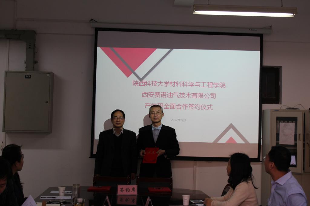 11月24日下午,材料学院与西安费诺油气技术有限公司产学研全面合作签约仪式在实验楼1C-218举行。学院党政领导、各系(实验室)主任及西安费诺油气技术有限公司张建勇先生一行共同出席本次签约仪式。