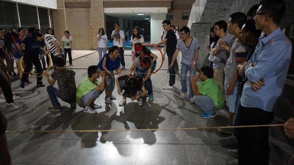 最为有趣的应该算是仙人指路和过五关斩六将两个部分。仙人指路分两轮进行,每轮主要由小组四个成员组成,需由一位同学指导其余三位蒙眼同学穿过有其他组队员设置的各种障碍,这个活动同时也考察了小组成员的团结合作精神。过五关斩六将,顾名思义,即活动由不同的小节组成,主要包括:转圈投球、对踢毽子、运球过障碍、跳大绳、合作向前跑,这部分活动需由小组所有成员都参与进来,这充分体现了活动策划者的细致周到的责任心。